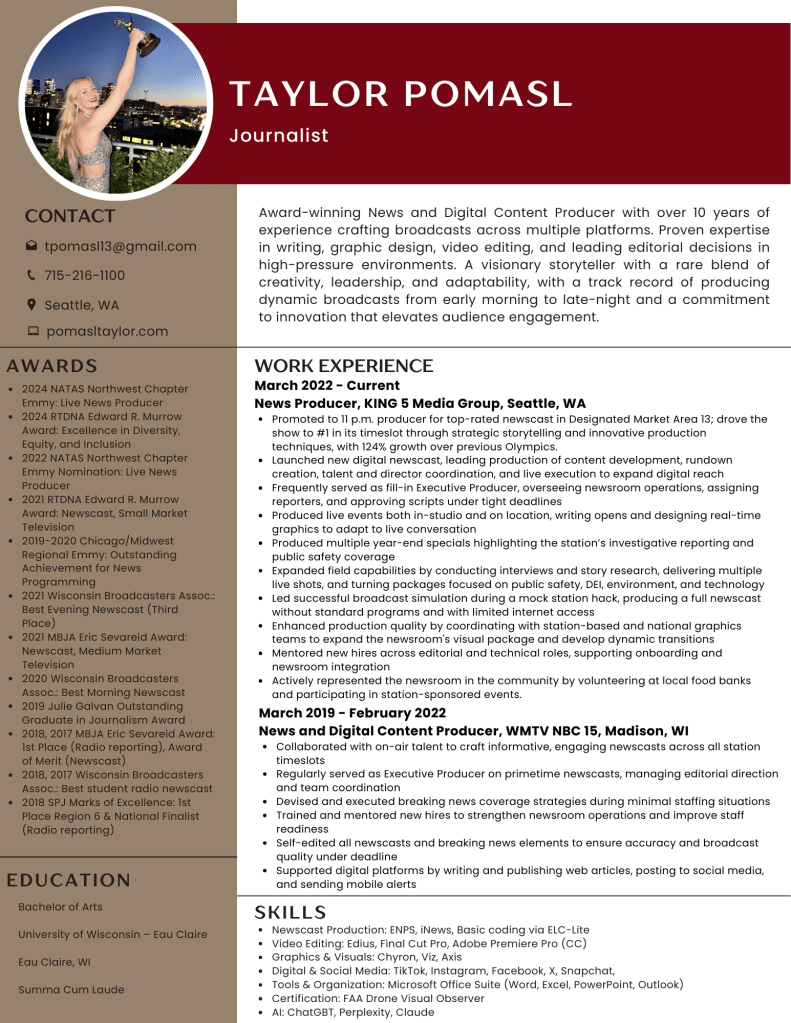 I’m an award-winning News Producer at King 5 in Seattle, Washington, an NBC affiliate. I have over 10 years of experience crafting compelling newscasts across multiple platforms, with proven expertise in writing, graphic design, video editing, and leading editorial decisions in high-pressure environments. I’m a visionary storyteller with a track record of producing dynamic broadcasts from early morning to late-night, with a commitment to innovation and elevating audience engagement through impactful journalism.